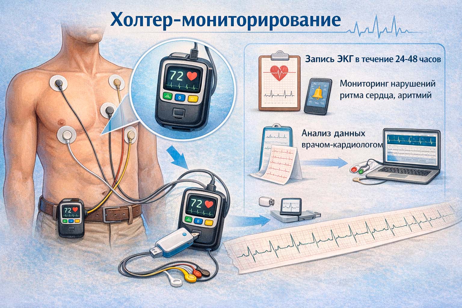 Чтобы «поймать» скрытую проблему, кардиологи используют Холтеровское мониторирование - непрерывную запись ЭКГ в течение 24 часов (иногда до 7 суток).
