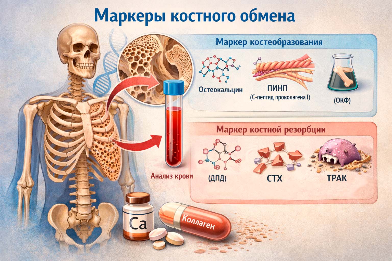 - P1NP (N-терминальный пропептид проколлагена 1 типа) — это маркер образования кости. Особо ценен при лечении анаболическими препаратами — он должен повышаться. При лечении антирезорбтивными препаратами он обычно стабилизируется.