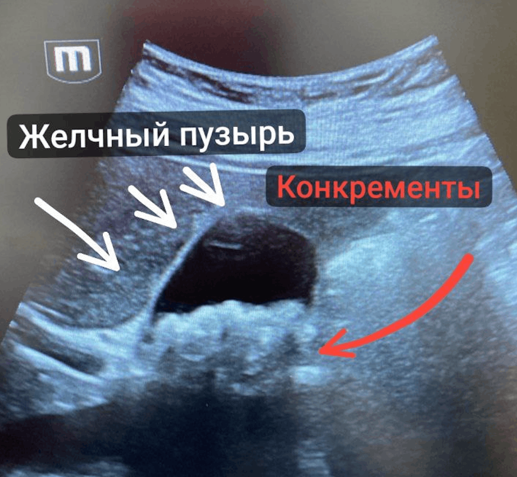 В ходе комплексного обследования была выявлена желчнокаменная болезнь (ЖКБ) как причина ее болей – при ультразвуковом исследовании органов брюшной полости обнаружены множественные конкременты в желчном пузыре с косвенными признаками билиарной гипертензии (повышения давления в желчных протоках, чаще всего которое возникает при наличии конкрементов в данных протоках)